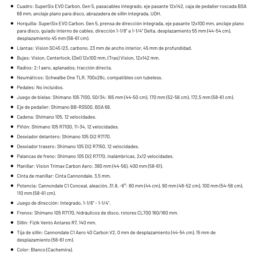 La precisión electrónica se encuentra con la geometría de carrera probada. La SuperSix EVO 5 combina el ligero cuadro de carbono Gen 5 con el cambio electrónico 105 Di2 de Shimano y las ruedas de carbono SC45 de Vision. El manillar Vision Trimax Aero, junto a nuestra potencia Conceal y el tubo de dirección Delta, logran una parte frontal de formas limpias. Una bicicleta bien montada, con una estética impresionante e increíblemente rápida, para ciclistas que están subiendo de nivel.